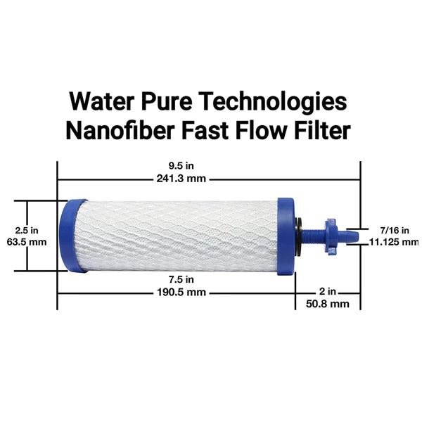 - Large 2 1/2" x 7 1/2" Nano Filter with a 5-micron outer wrap